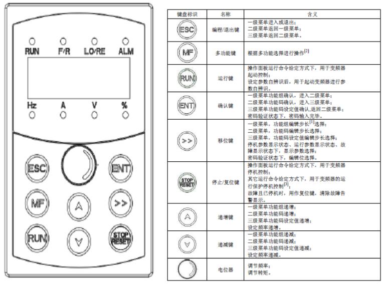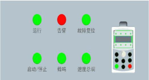 控制面板有啟動/停止旋鈕,速度調(diào)節(jié)旋鈕,變頻器顯示和設(shè)置小面板,還包括運(yùn)行、蜂鳴、告警指示燈,*作簡單。